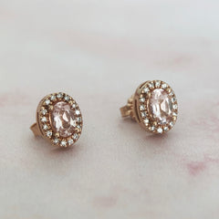 Aretes con morganita central corte oval con halo de diamantes en oro blanco 14K.
