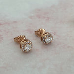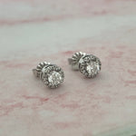 Clásicos aretes con diamante central y halo de diamantes engastados en francés (french v split) en oro 14K.