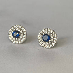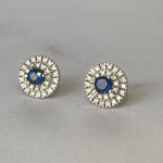 Aretes con zafiro con doble halo de diamantes en oro blanco 14K.