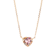Colgante de zafiro arcoíris corte corazón con halo de zafiros arcoíris melee en oro amarillo 14K. Color del zafiro central rosa.