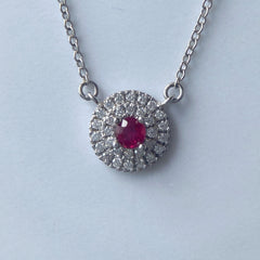 Colgante con rubí con doble halo de diamantes en oro blanco 14K.