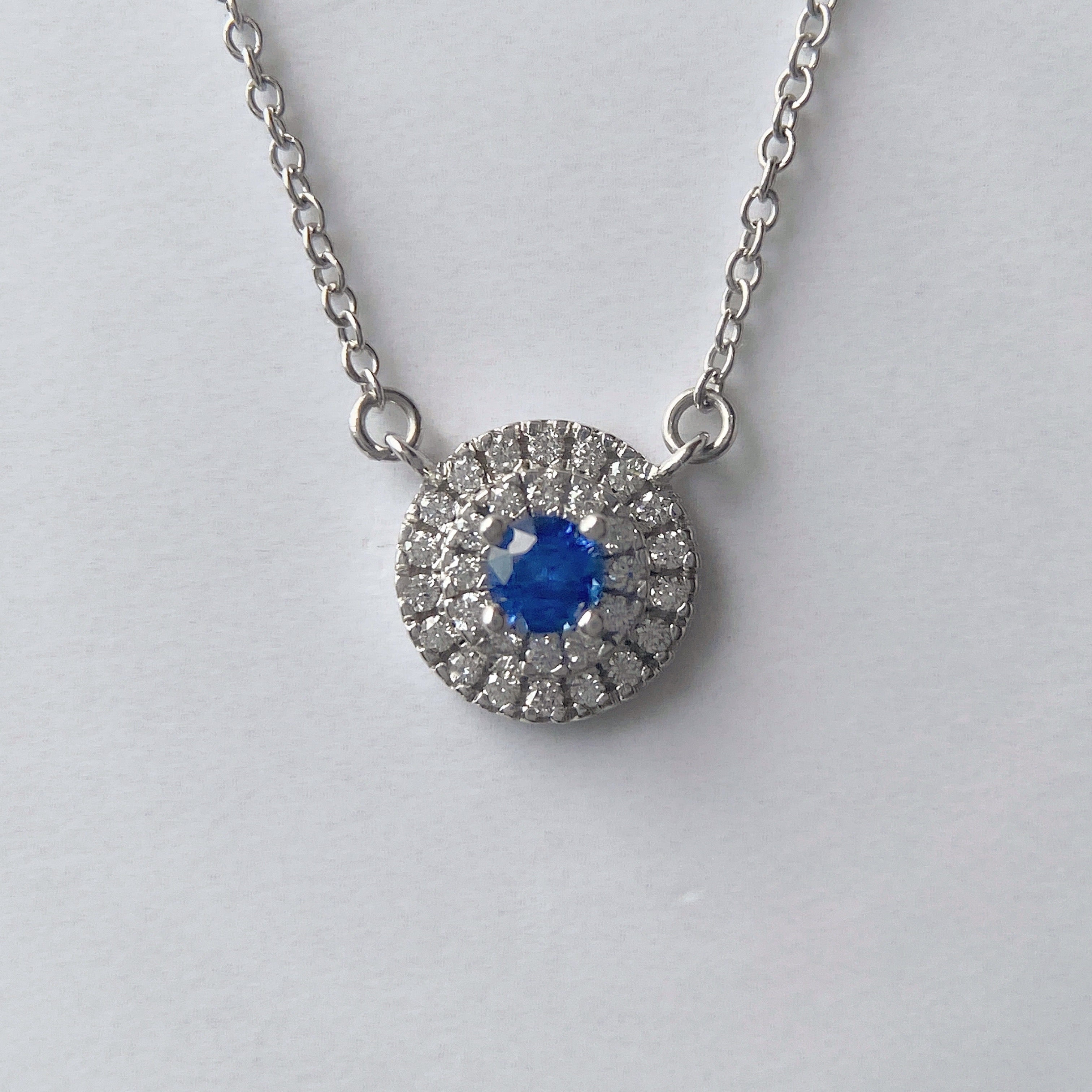 Colgante de zafiro con doble halo de diamantes en oro blanco 14K.