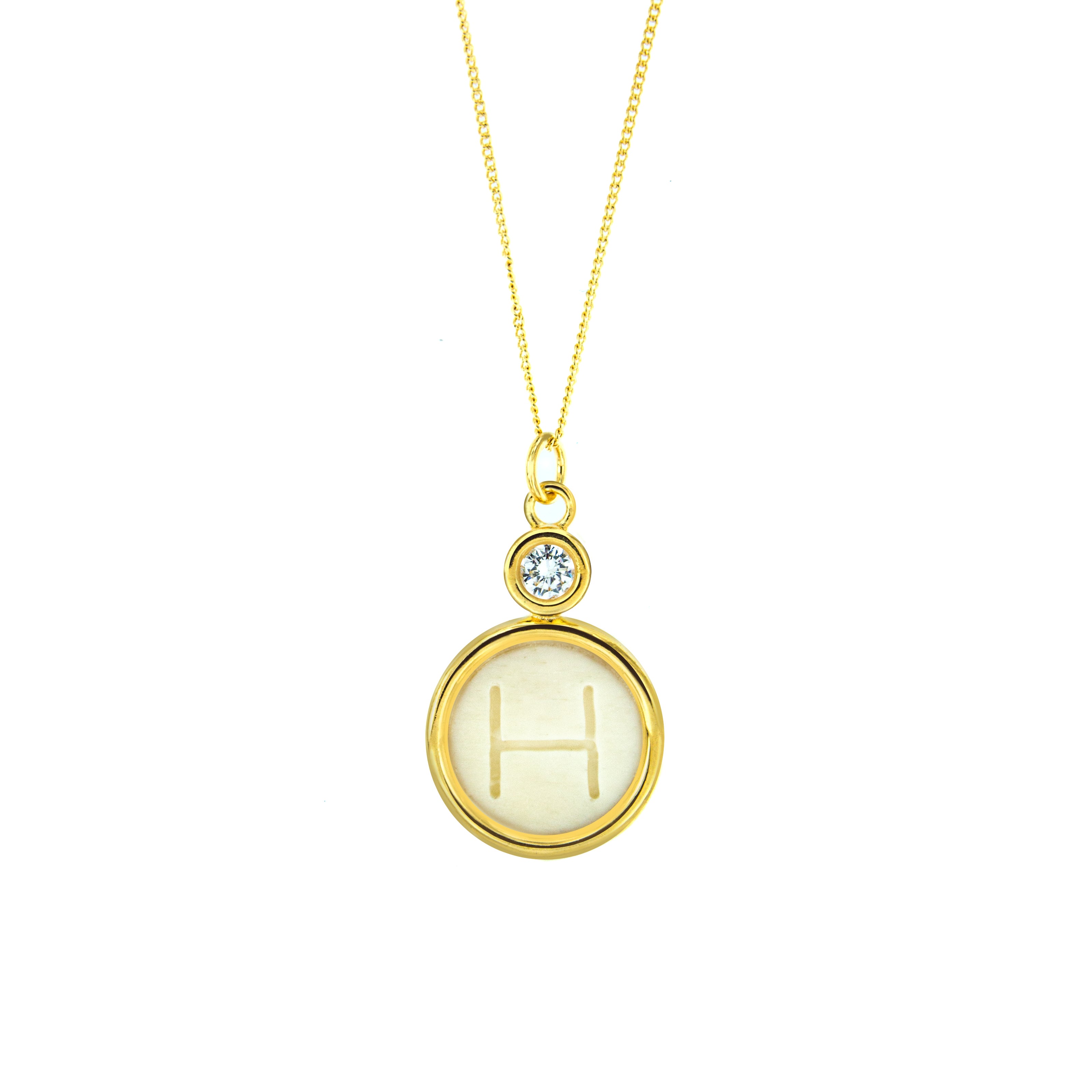 Dije de hueso bovino tallado a mano y cristal Swarovski® en marco de chapa de oro con la letra H. Es un regalo perfecto para Haydée, Helga o Hilda.
