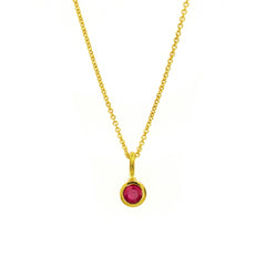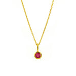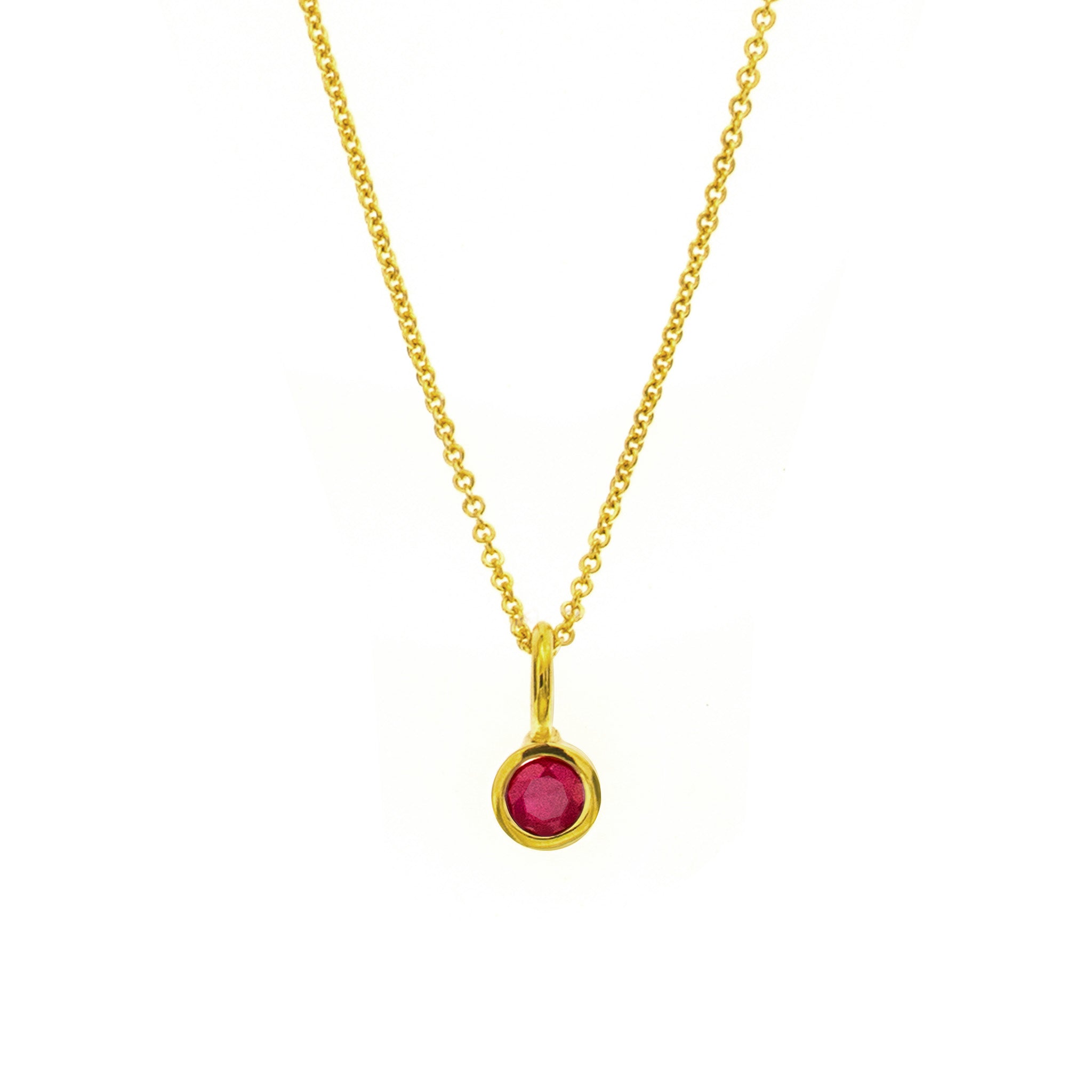De color rojo, el rubí es una de las piedras reinas, junto con la esmeralda y el zafiro. Simboliza la pasión, promueve la integridad y la prosperidad. Plata 925 chapa de 22k. Cadena 45 cm. Diámetro del rubí 4.5 mm, gema natural calidad comercial.