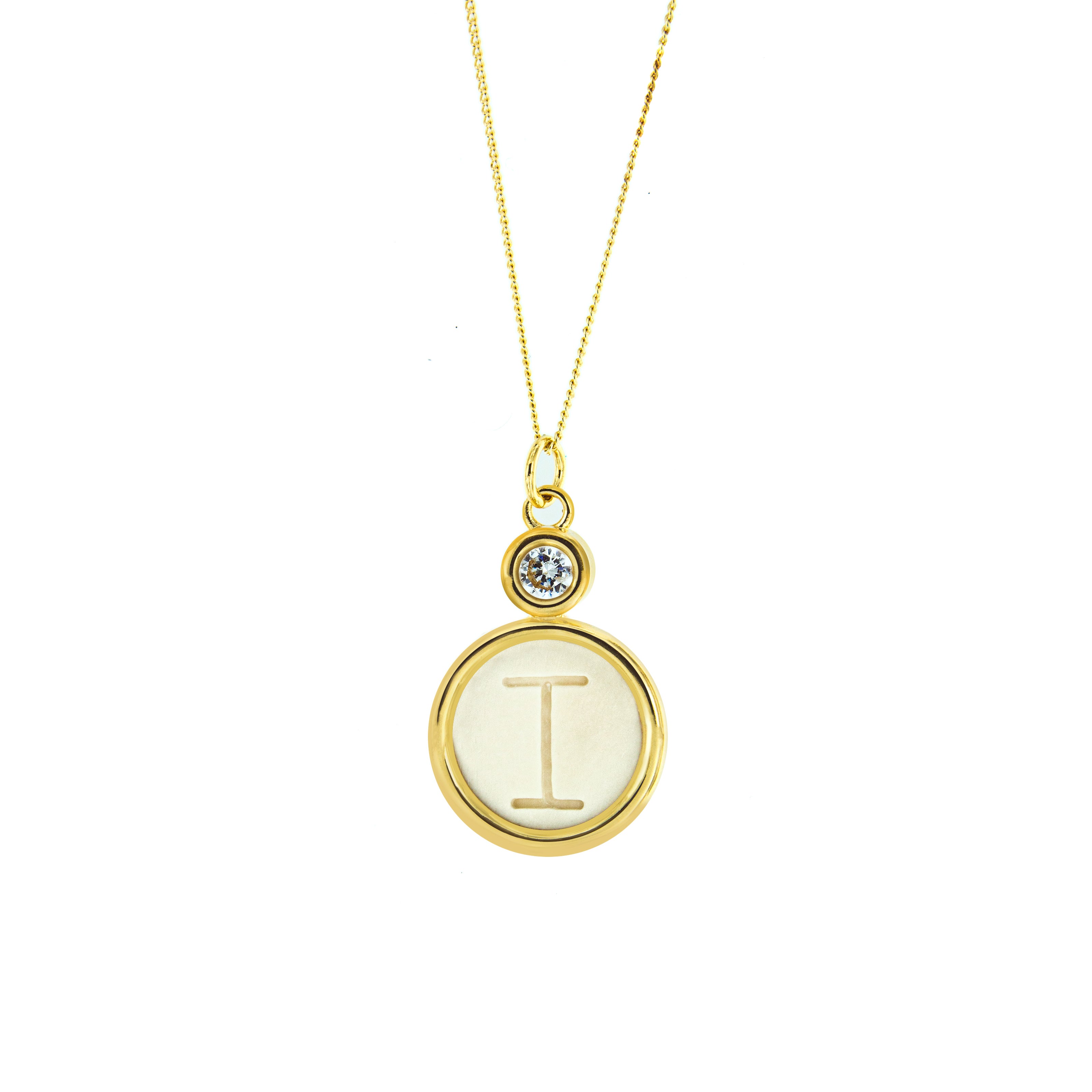 Dije de hueso bovino tallado a mano y cristal Swarovski® en marco de chapa de oro con la letra I. Es un regalo perfecto para Ivette, Ingrid, Inés o Isabel.