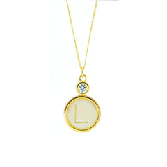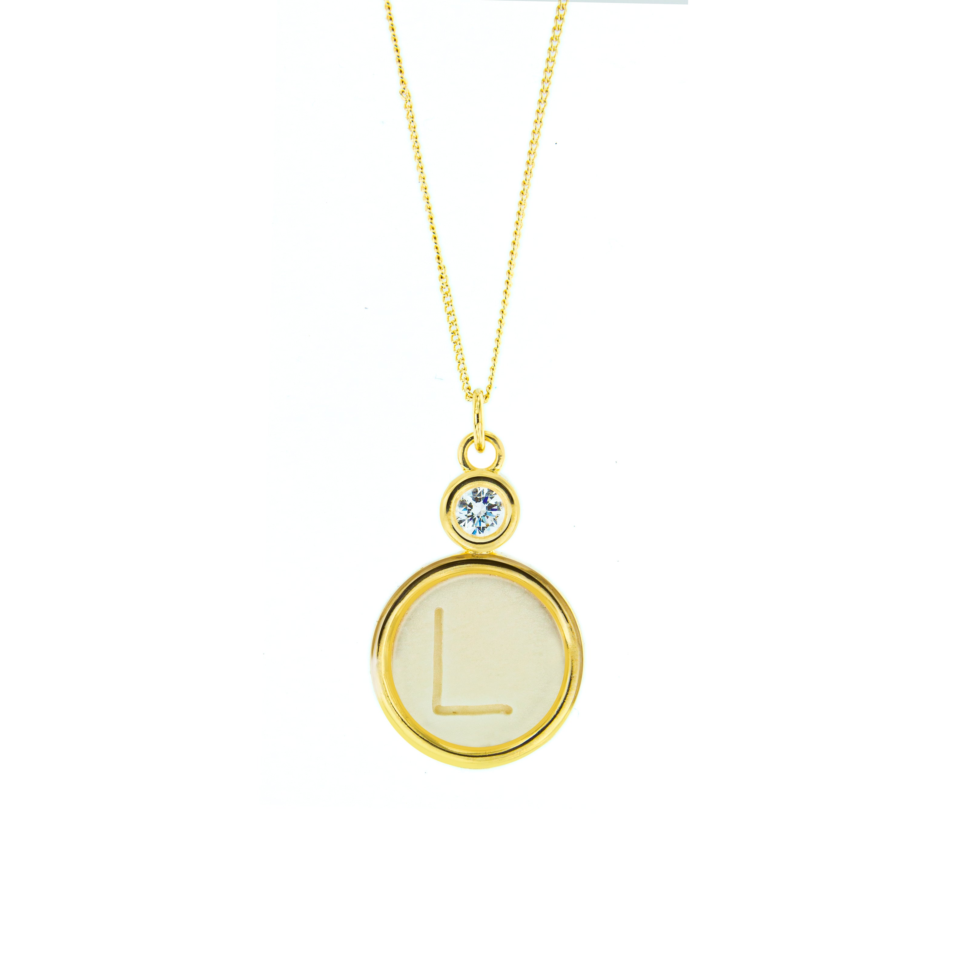 Dije de hueso bovino tallado a mano y cristal Swarovski® en marco de chapa de oro con la letra L. Es un regalo perfecto para Lizette, Linda, Lourdes, Lucía o Leonora.