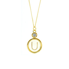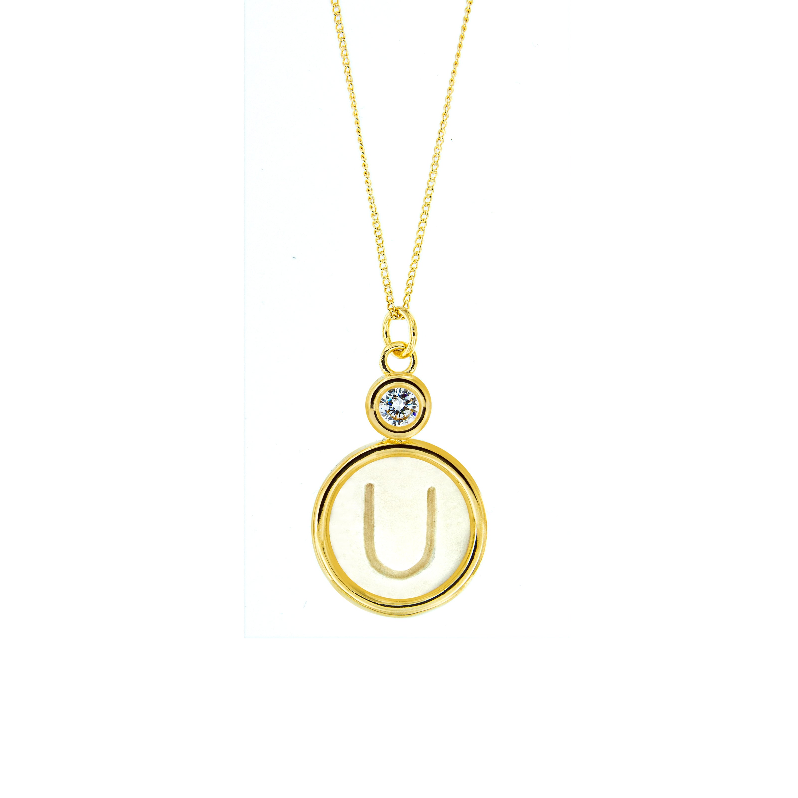 Dije de hueso bovino tallado a mano y cristal Swarovski® en marco de chapa de oro con la letra U. Es un regalo perfecto para Úrsula.