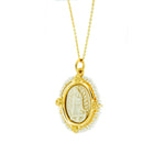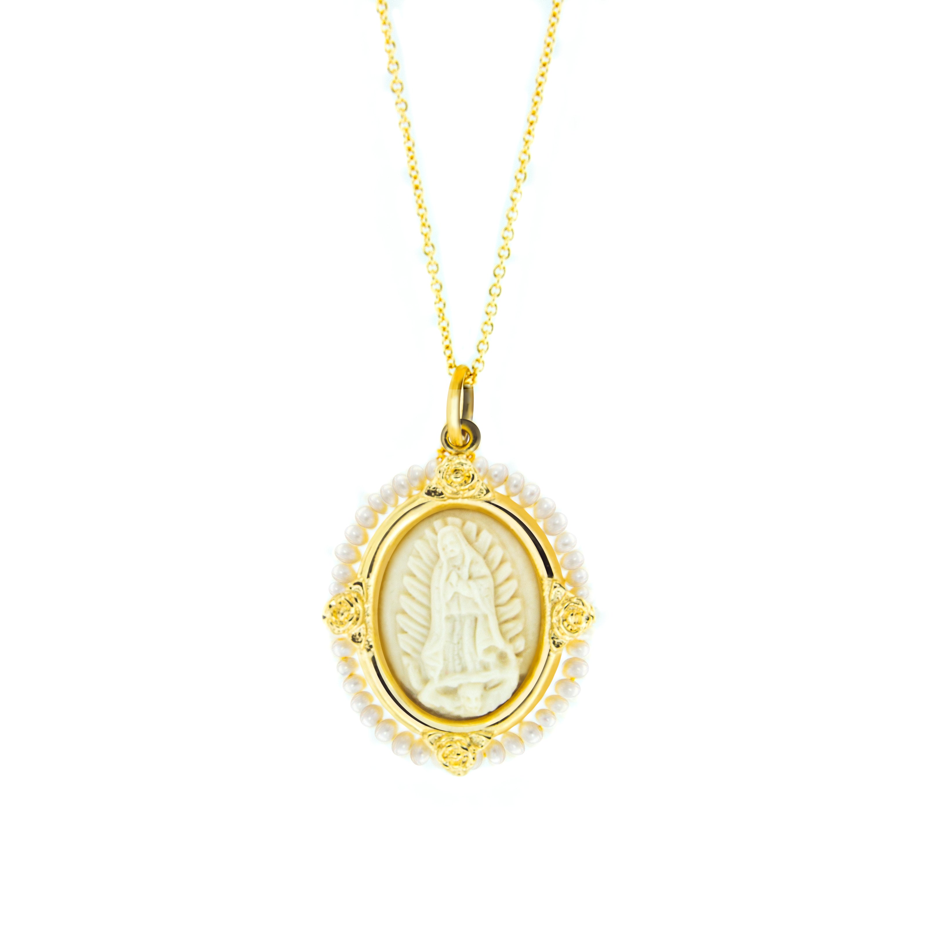 Medalla Virgen de Guadalupe tallada a mano en hueso bovino en marco con rosas y perlas cultivadas.